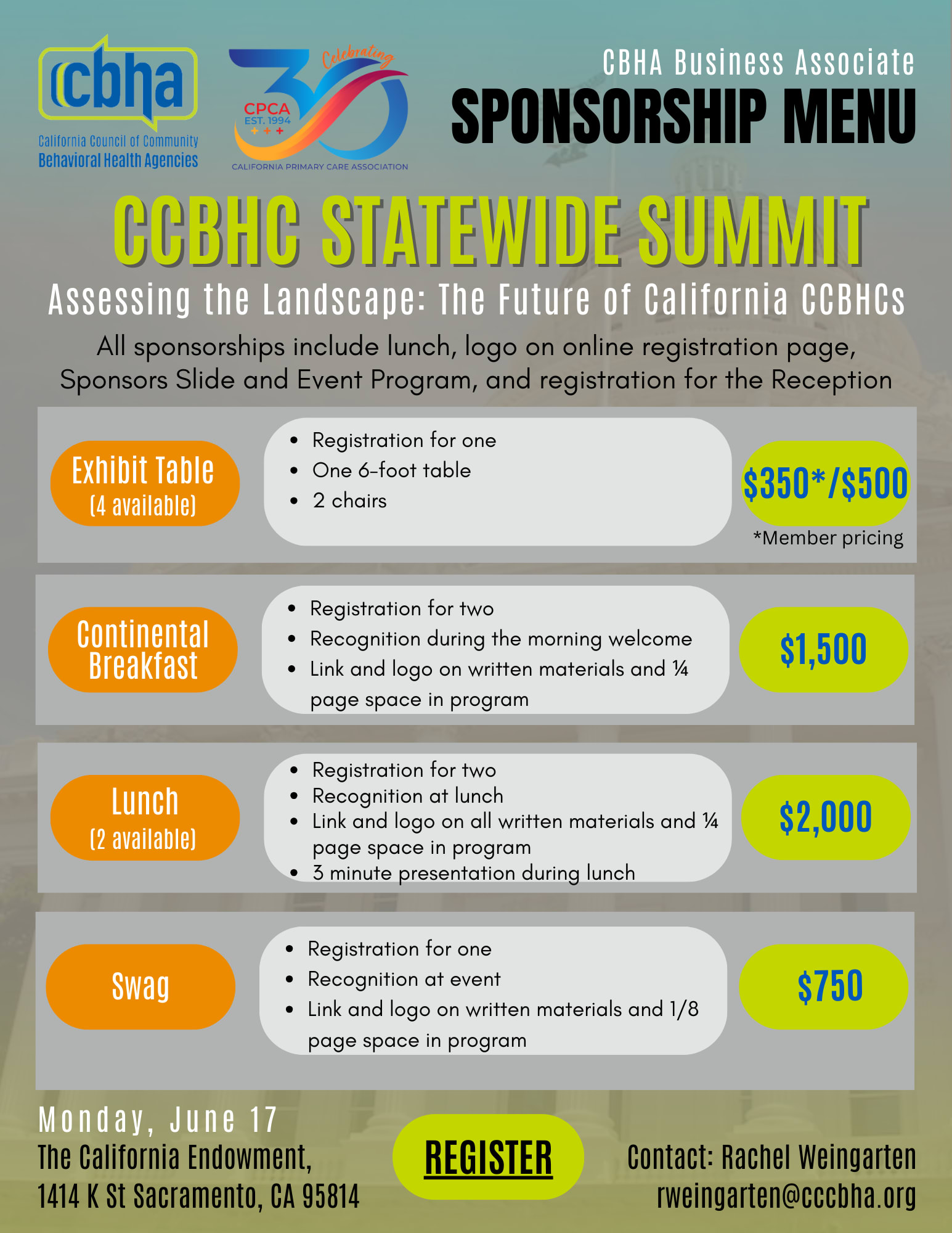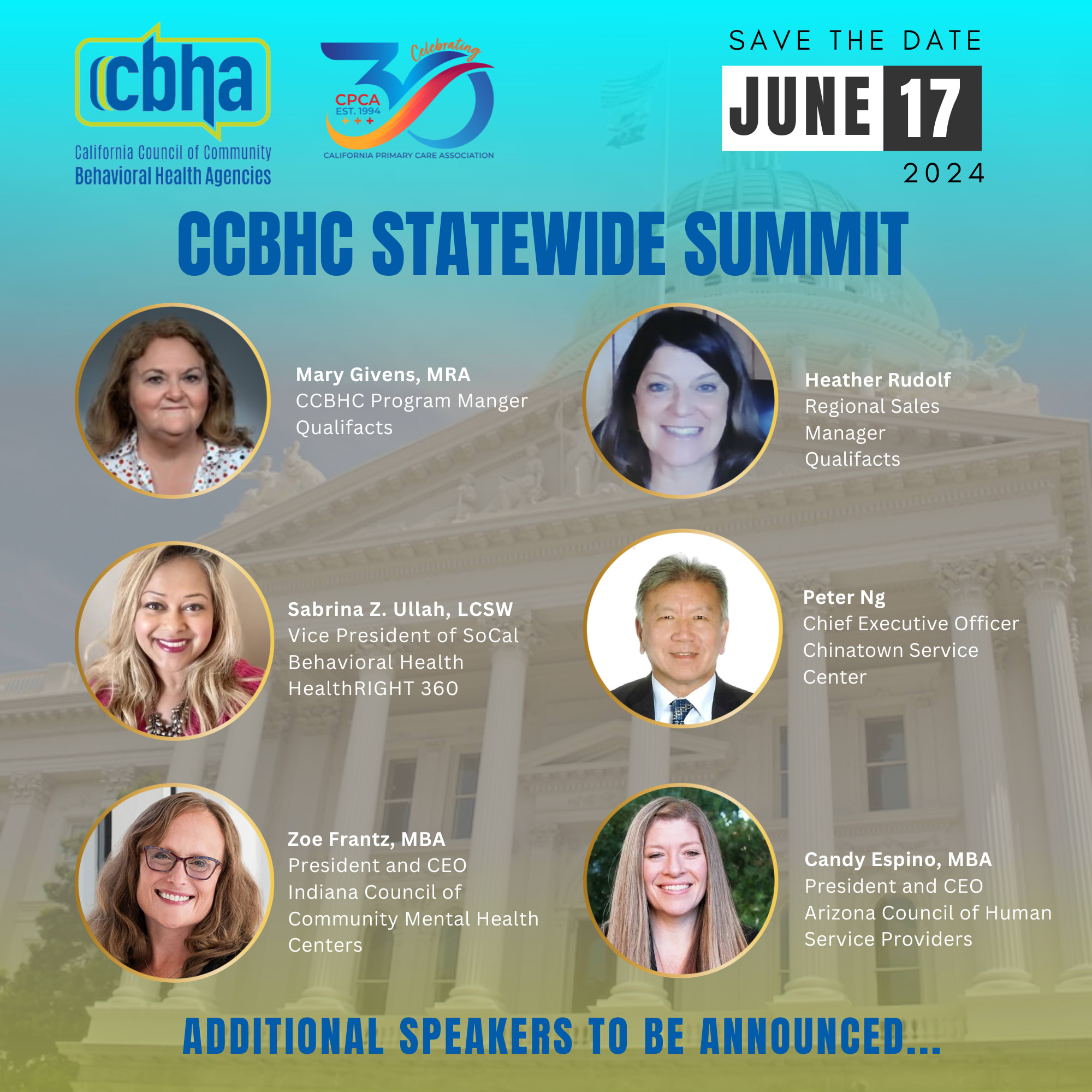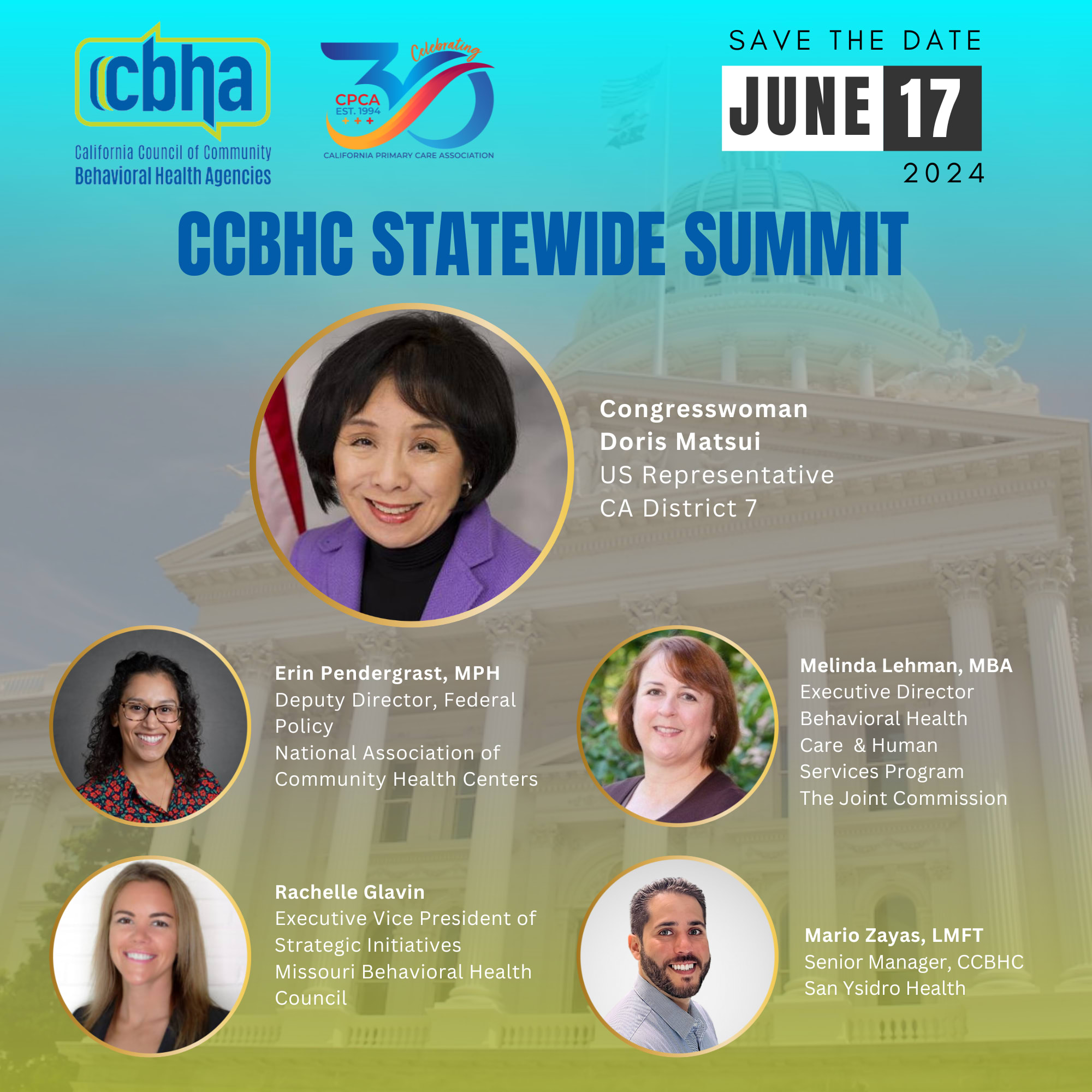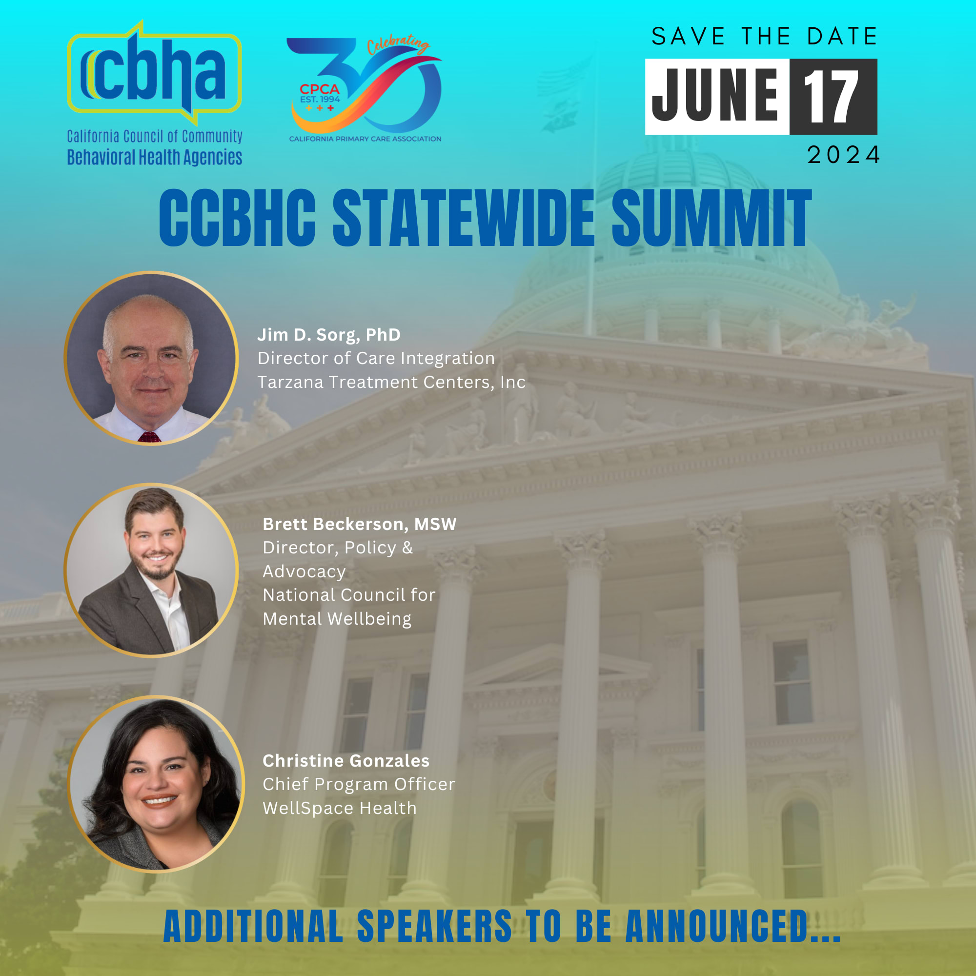 CBHA and CPCA are partnering to co-host California's inaugural Certified Community Behavioral Health Clinic (CCBHC) Summit. This Summit is an opportunity for those interested in learning more about the CCBHC program and those who have received funding to come together and share best practices and hear from state and federal experts.